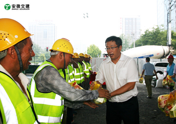 副市長寧波向奮戰(zhàn)在高溫下的工程建設者們表示感謝,給安徽交建一線員工送去了仁丹、風油精、肥皂、毛巾、礦泉水、綠豆等防暑降溫用品,并同現場的同志們一一握手。寧副市長強調指出,當前工程進入大干階段,又值高溫時節(jié),希望項目施工方科學調度、合理安排,既保證工期,又確保安全生產,防止發(fā)生高溫中暑等事件。嚴格落實防暑降溫措施,對從事高溫作業(yè)和戶外作業(yè)的員工,要制定合理的作息制度。相關部門要根據各自職責,積極主動地做好服務保障工作,保障好每一位建設者的人身安全和健康。在得知項目工程進展順利后,寧副市長還詳細地了解了工地的避暑措施,并再三囑咐現場負責人,要加強安全管理、合理安排施工、避免強高溫時段室外作業(yè)、保障職工身心健康,并在確保工程質量和施工安全的基礎上,進一步加快項目建設進度,努力交上一份完美答卷。