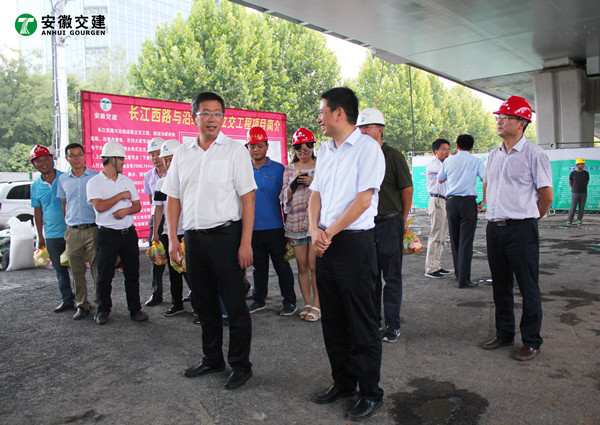 7月28日下午,合肥市副市長寧波在市重點局局長張家祥、副局長鄭浩、安徽省交通建設股份有限公司(以下簡稱安徽交建)總裁高楊等人的陪同下,蒞臨安徽交建長江西路與沿線道路立交工程項目施工現場,慰問奮戰(zhàn)在高溫一線的道路建設者們。