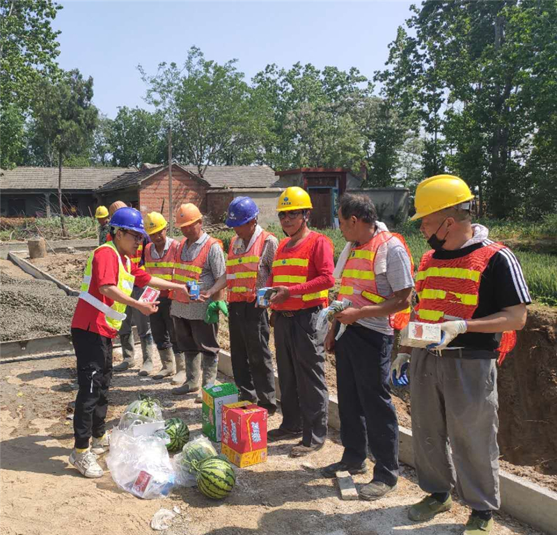 施工加速度的背后是汗水。在五一期間,界首市氣溫連續(xù)一周高達36℃,項目部完善高溫作業(yè)應急處理預案,合理安排作息時間,減少了白天室外作業(yè)時間,披星戴月、節(jié)假無休的搶工模式也成了家常便飯?!翱嗍强嗔它c,但也是鍛煉的好機會,雖然任務重,但是大家戰(zhàn)斗在一起,共同為榮譽而戰(zhàn),多苦也是值得的?!表椖坎抗芾砣藛T這樣說道。為保障每一位工人的人身安全,項目部還積極向作業(yè)人員宣傳高溫期間防暑降溫基本常識和救援知識,增強高溫天氣預防中暑的安全意識和急救能力,并為各工區(qū)施工人員發(fā)放防暑降溫物品。